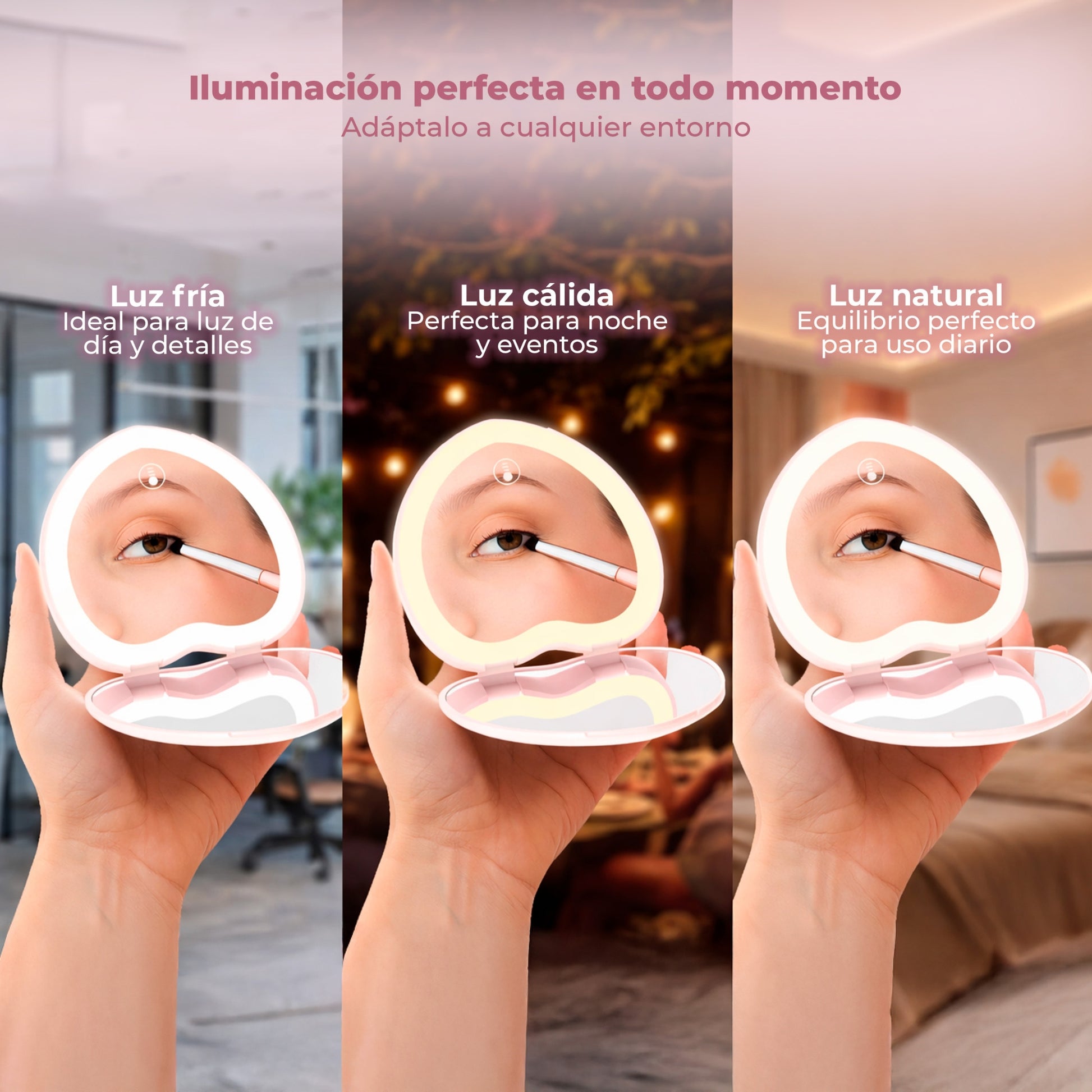 ILUMINACIÓN LED CON 3 MODOS DE LUZ: Este espejo compacto cuenta con un aro de luz LED con tres tonos de iluminación que ayudan a mejorar la visibilidad al maquillarte o retocar tu look. El brillo puede ajustarse fácilmente mediante botón táctil para adaptarse a diferentes condiciones de luz.