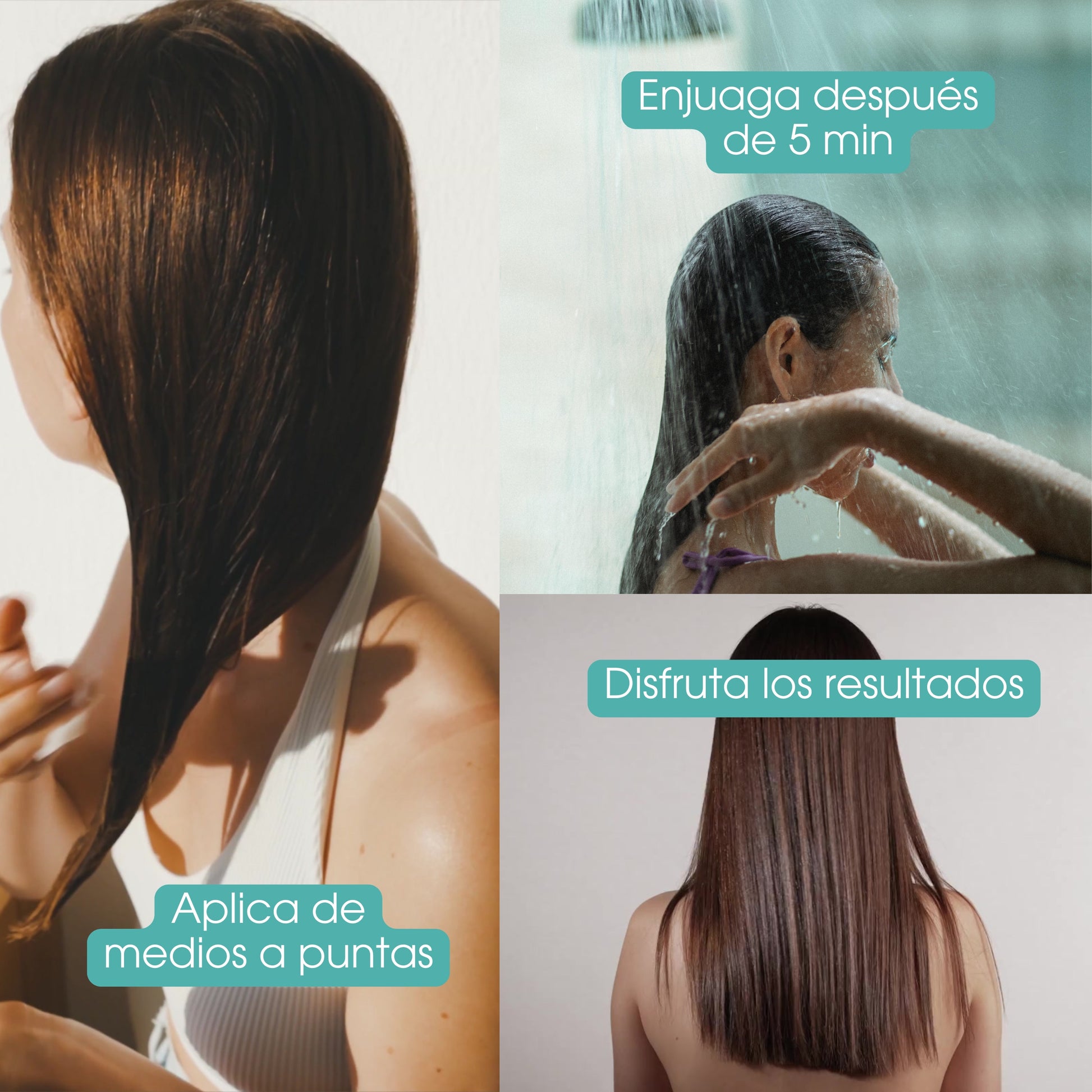 PRACTICAL INSTRUCTIONS FOR USE: Wash with shampoo, remove excess water, apply the mask for 2 to 4 minutes (if you apply heat with a thermal cap, the result will be even better) and rinse.