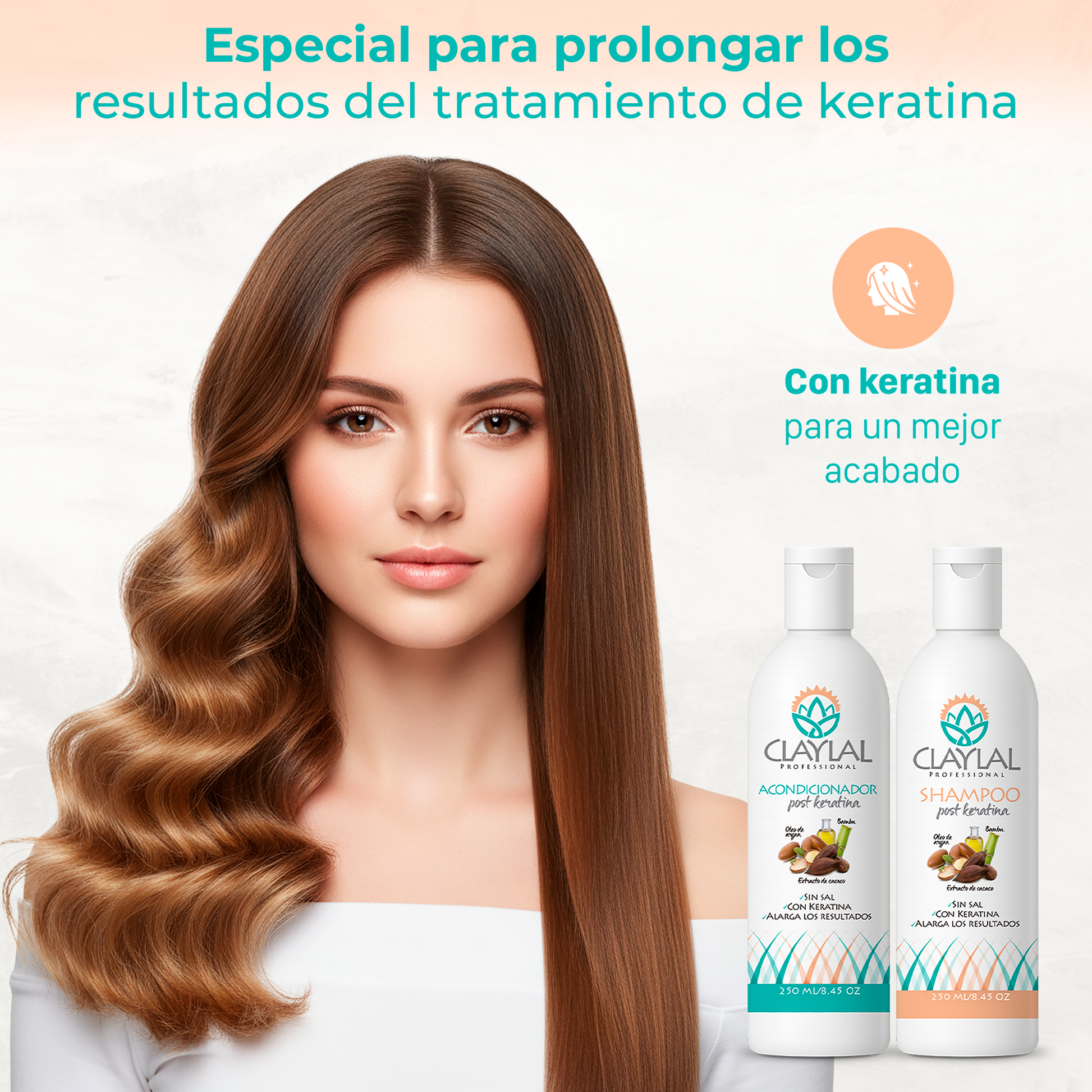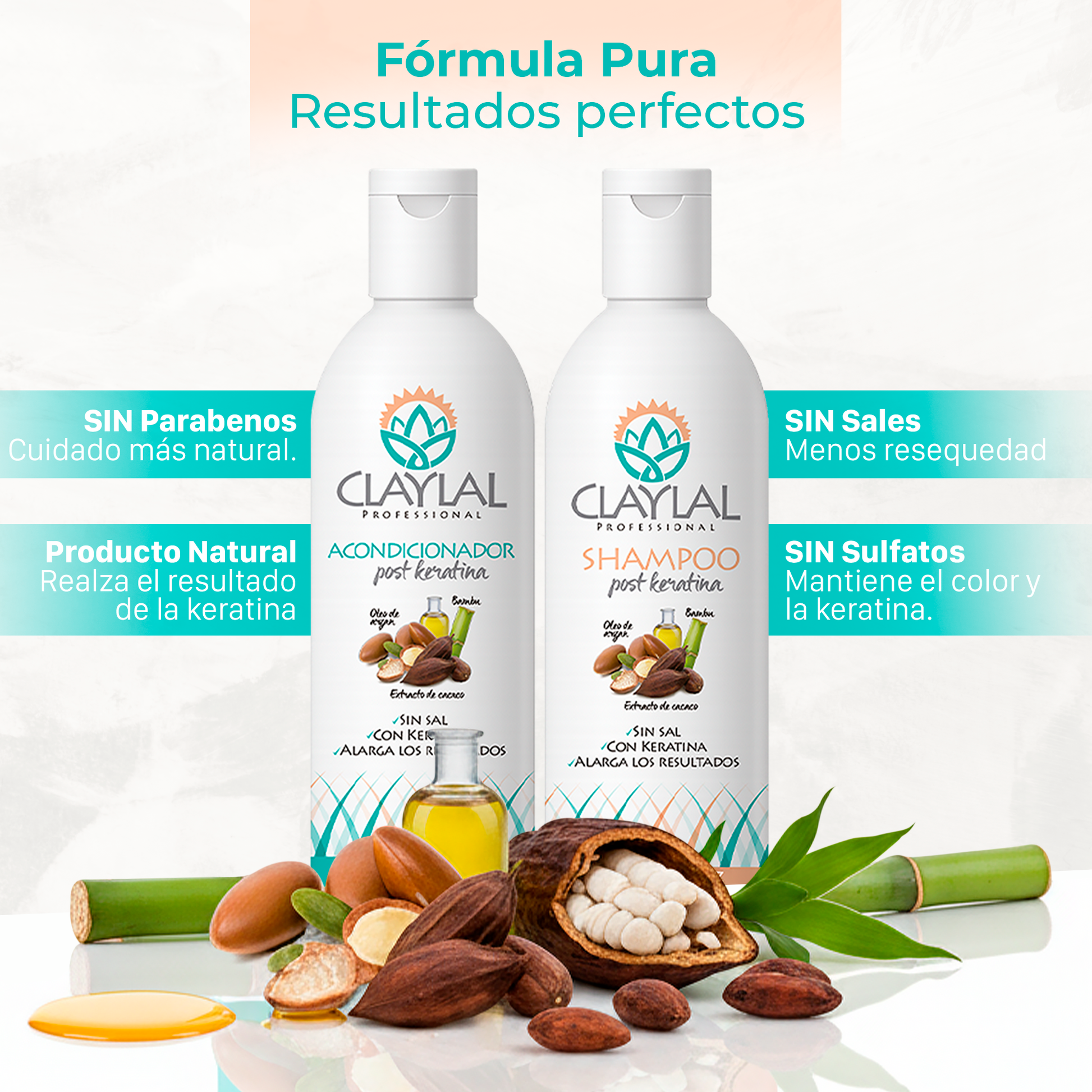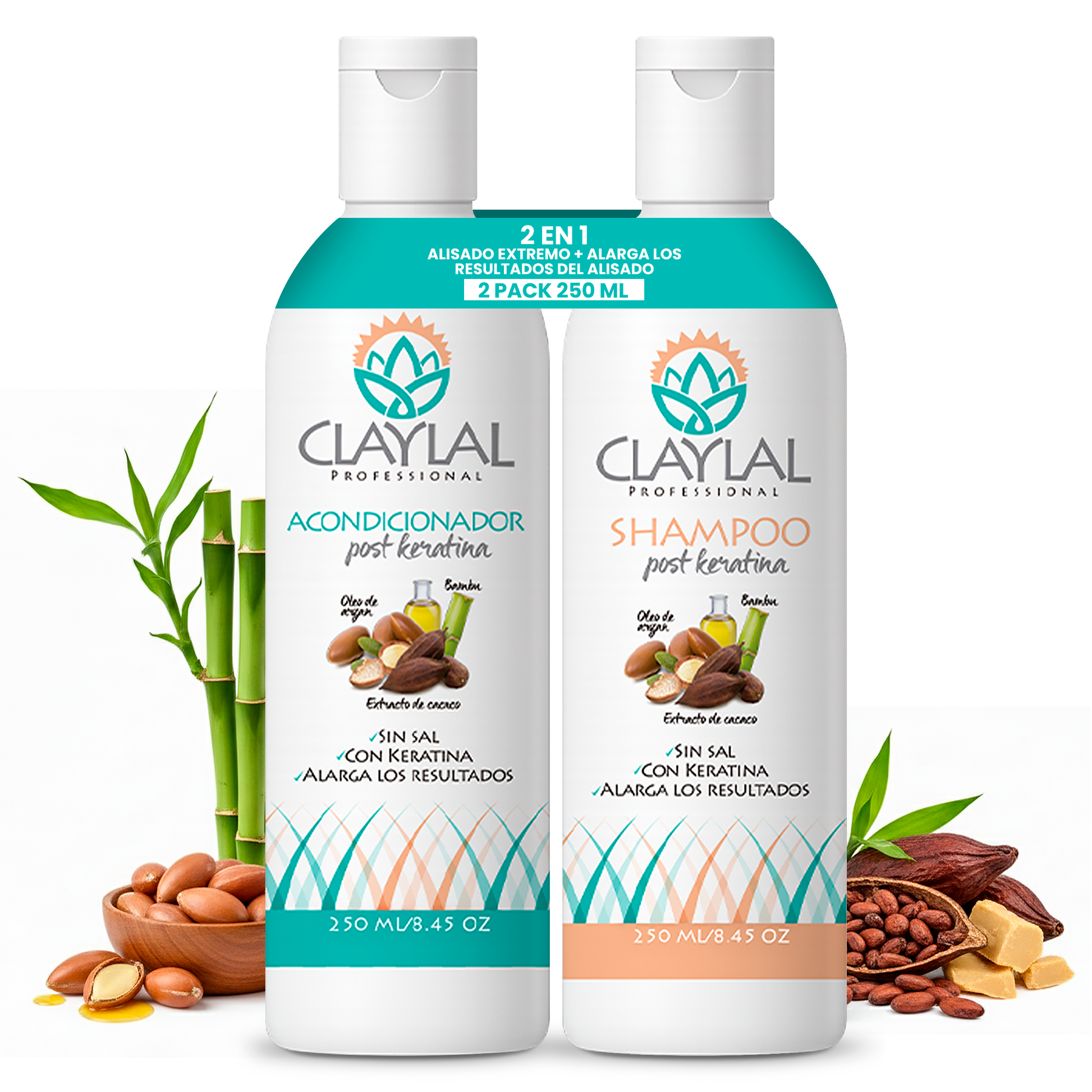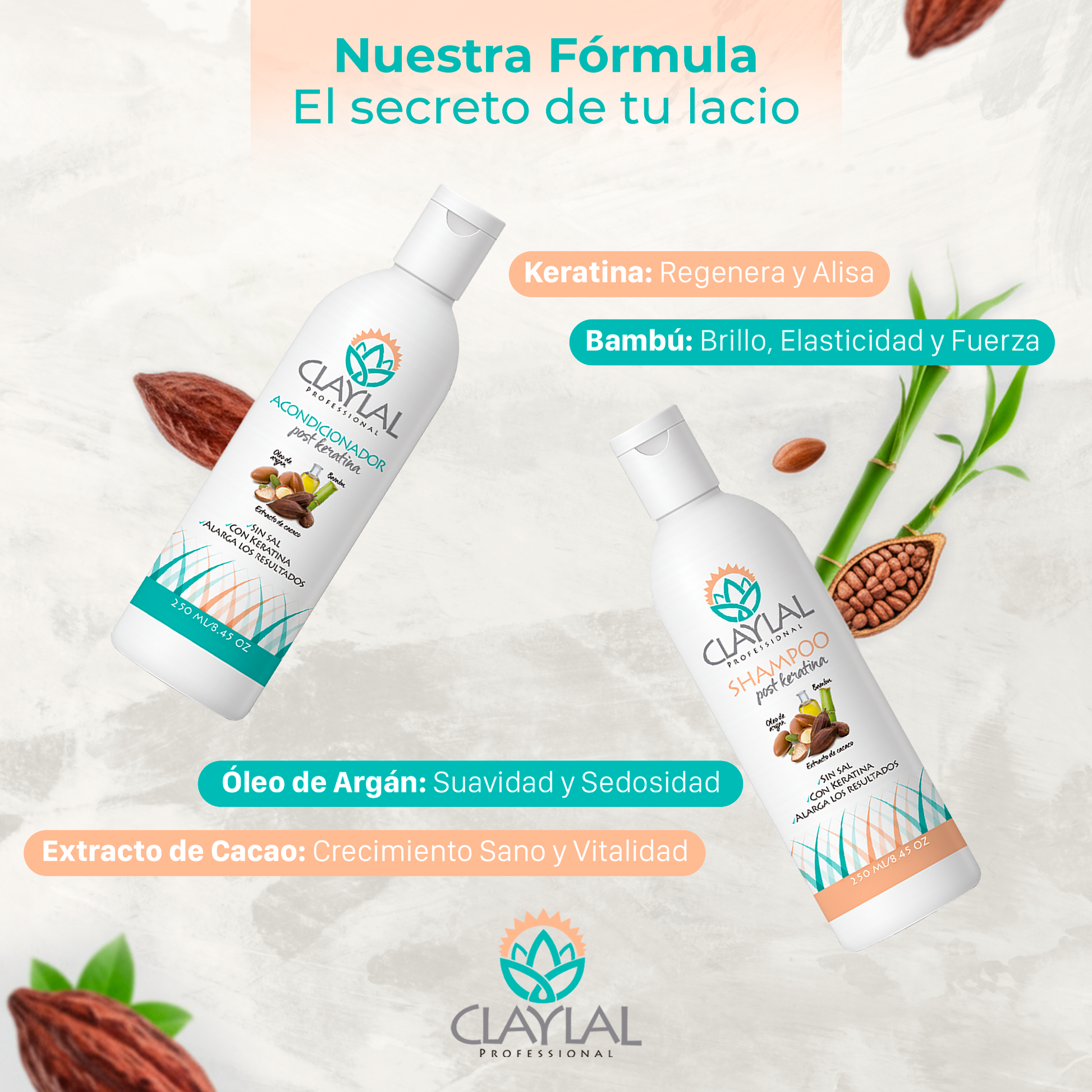 CONTENIDO: Shampoo + Acondicionador con Keratina, Extracto de Cacao, Bambú y Óleo de Argán. Fórmula profesional sin sal, sin sulfatos, ni parabenos.